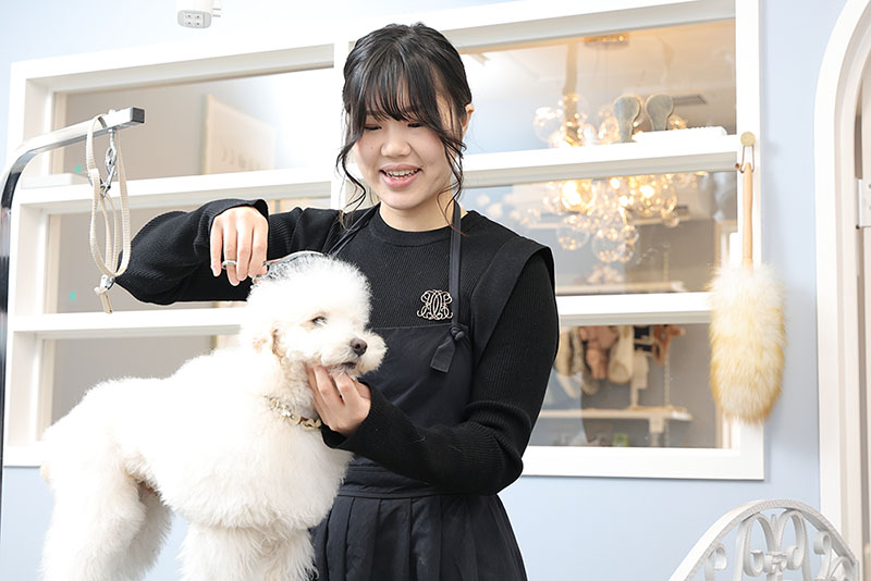 2021年11月にドッグサロンをオープンしました。技術力でワンちゃんの魅力を引き出すトリミングを心がけています。コンテストで入賞したり、SNSで発信したりして知名度もアップ。予約待ちのお客様も増えました。オーナートリマーとして従業員の指導や経営も行い、大変ですが充実した毎日を送っています。私は動物看護師コースに入学しましたが、在学中に先生から技術力を評価してもらい「トリマーになればいいのに」と言われたことが私の運命を決めました。頭数、犬種、年齢、大きさ、性格など充実した実習環境で学んだことで実践力がついたと思います。