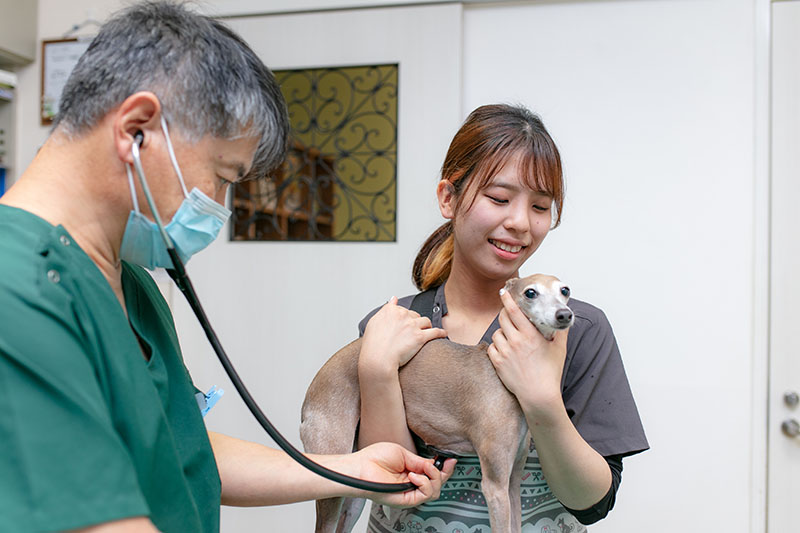ワンちゃん、ネコちゃんの問診や診察中の保定、食事の相談、入院管理などをしています。元気になって退院する動物たちを見られることや、飼主様から感謝の言葉をいただくことが喜びであり、やりがいを感じます。飼主様から食事やしつけの相談にも答えられるように、セミナーなどで積極的に勉強しています。私の在学中は国家資格が未実施だったので、前身の認定動物看護師の資格取得に向けて勉強を頑張っていました。卒業後に行われた第1回動物看護師国家試験にも合格したので、今後も責任を持って仕事に取り組んでいきたいです。